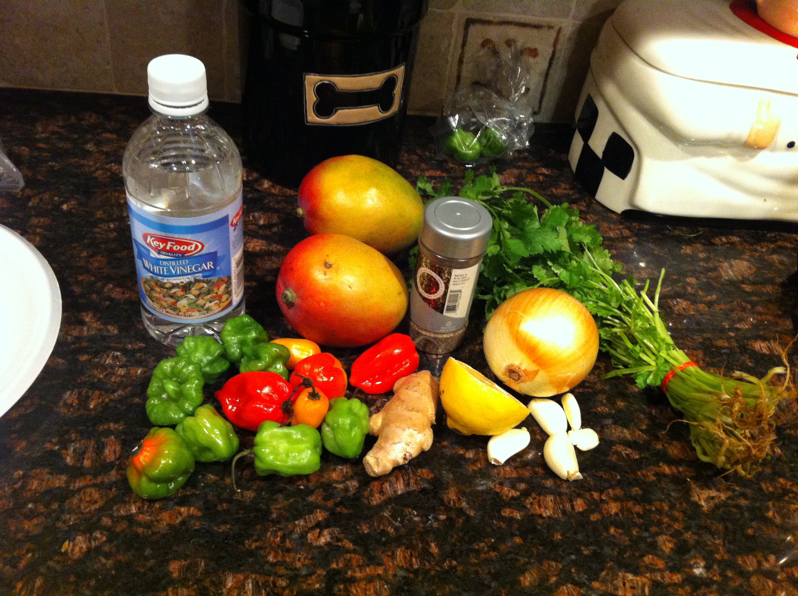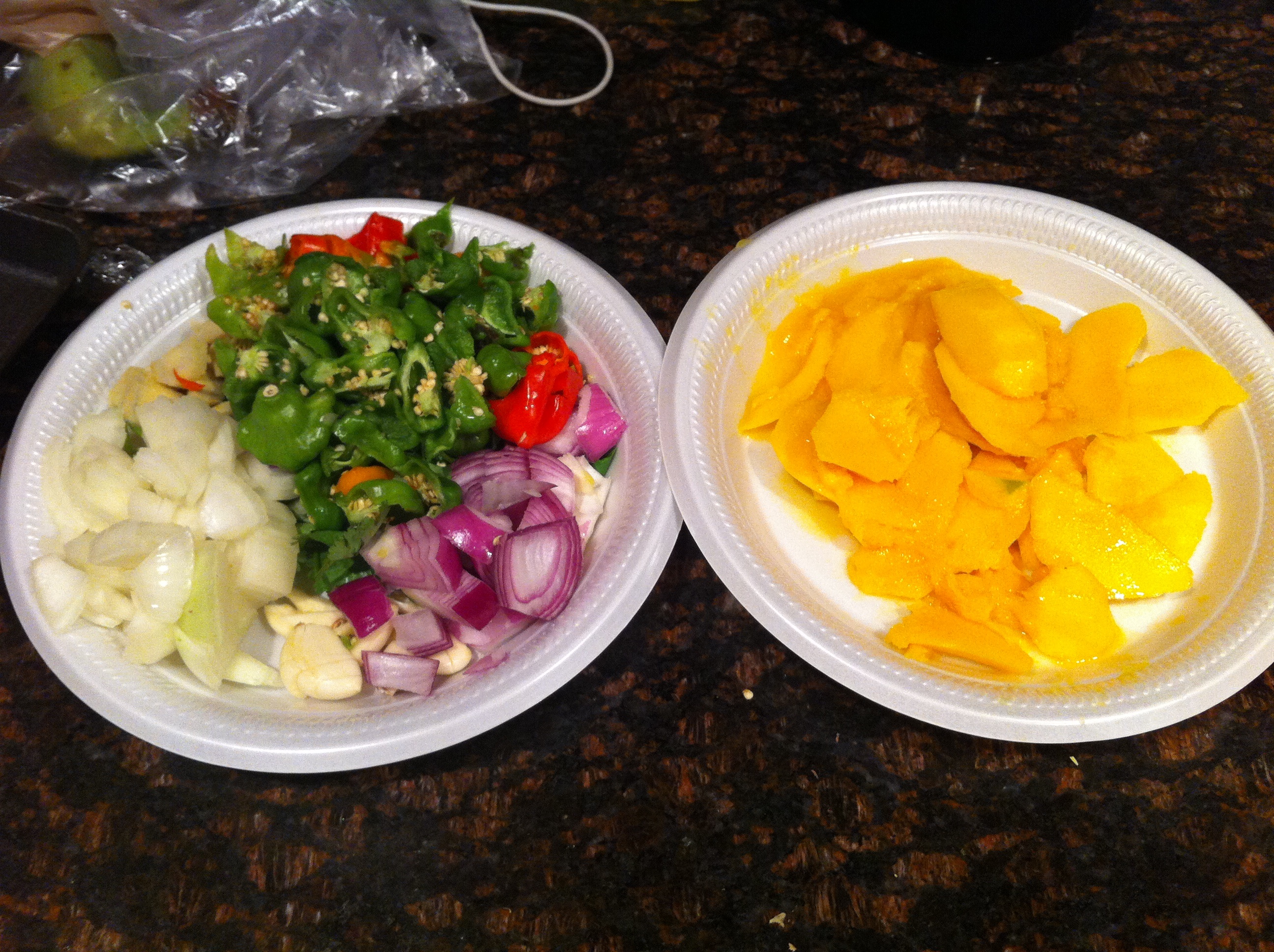 - Rough chop all of your ingredients… garlic, peppers, onions, cilantro, mangoes and ginger