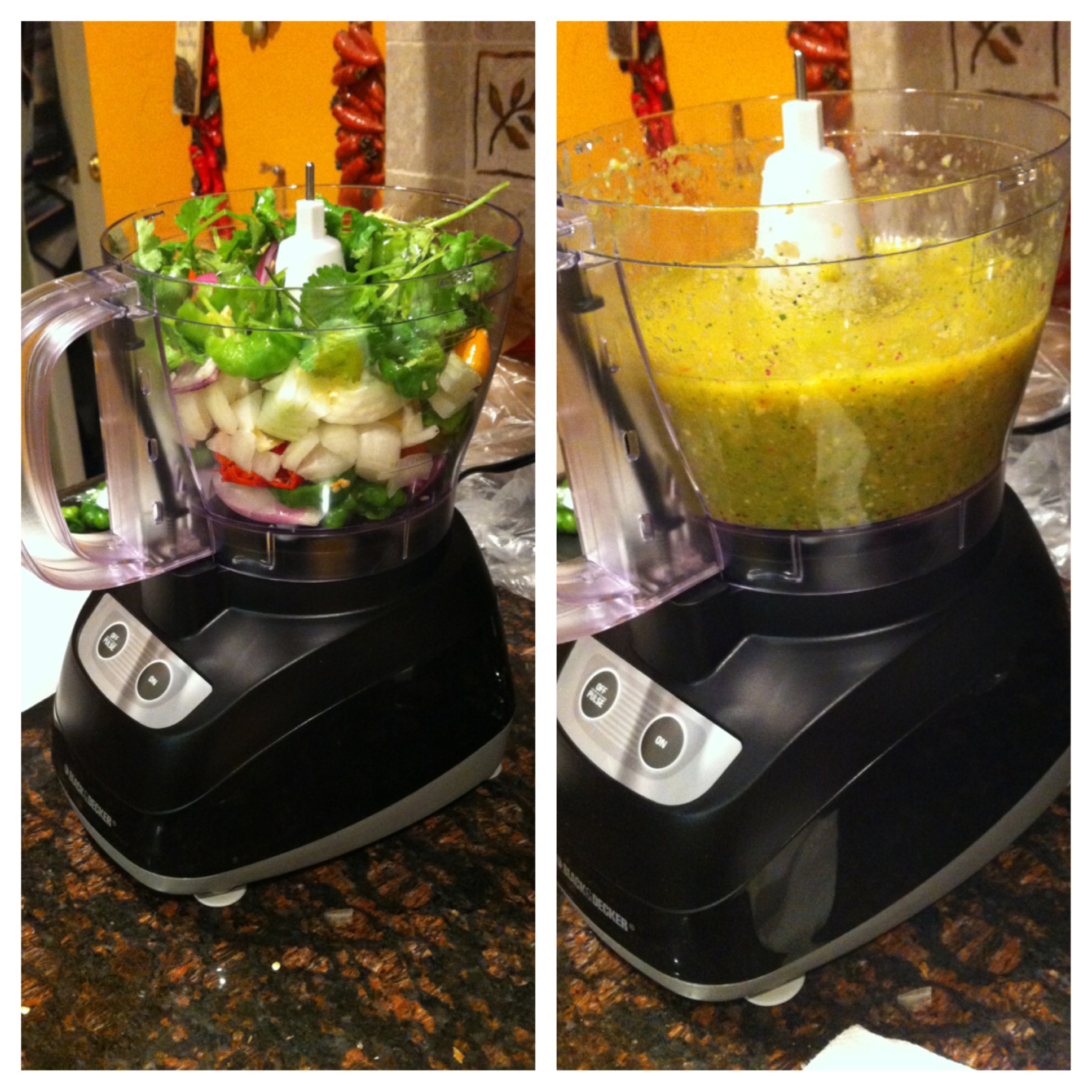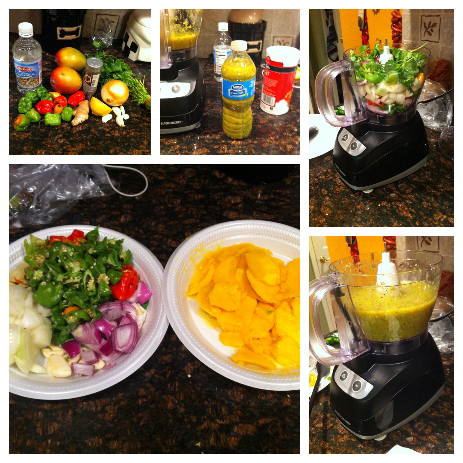 - Add ingredients into food processor—onions, garlic, cilantro, hot peppers, and ginger BUT set the mangoes aside