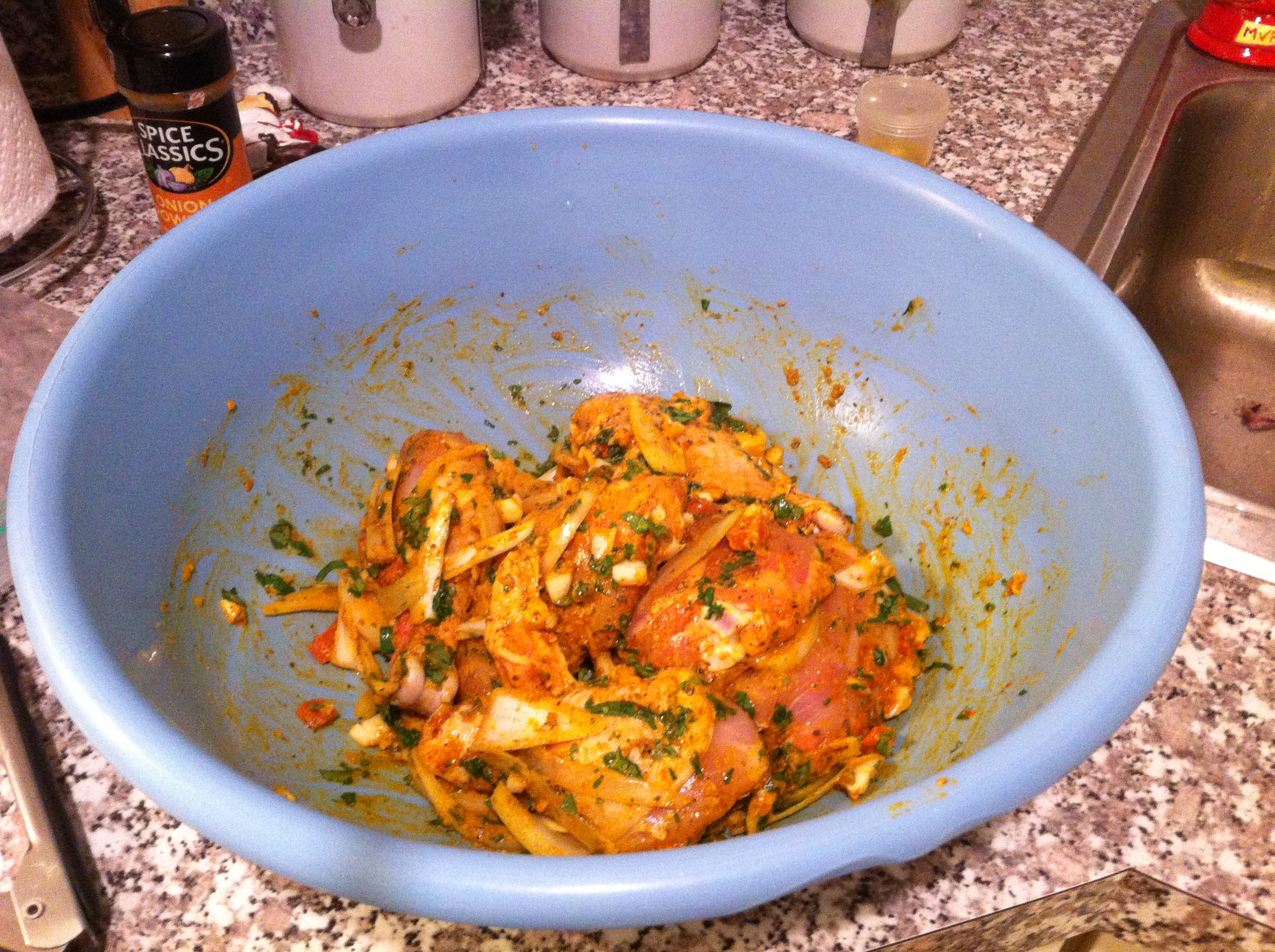 1. Clean your chicken with water, vinegar and lime juice (1 lime) removing the skin from the chicken thighs and place chicken in a mixing bowl.