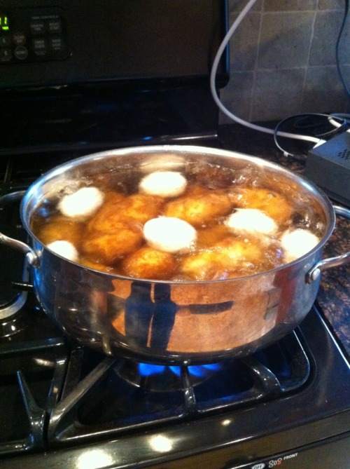 • Now boil potatoes and once the water begins to boil, add eggs (at room temperature!) into the water. Boil eggs for 15 minutes for perfect hard boiled eggs
