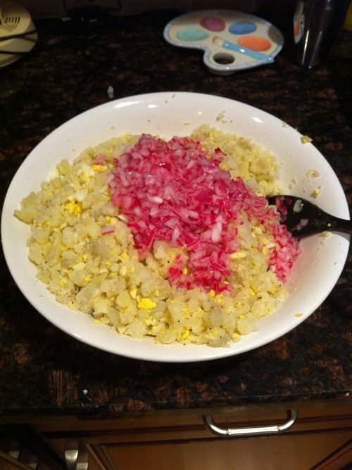 • Now add the diced up eggs and onions leaving behind the vinegar. Lightly mix adding some of the vinegar, salt and pepper along the way.